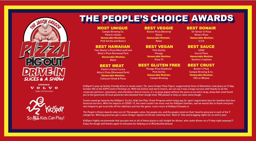 Thanks again for supporting the Pizza Pigout, and more importantly, for supporting KidSport so all kids can play.