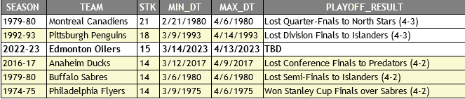 — And very few teams enter the postseason on a 15-game point streak like the Oilers (14-0-1) did. All previous five teams won their opening round. The 1975 Flyers won the Cup, the 2017 Anaheim Ducks lost in the third round, while the other three lost in the second round. Edmonton is hoping to join the 1955 Red Wings and 1975 Flyers.