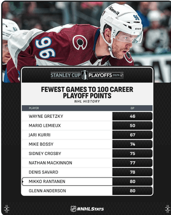 — Leon Draisaitl has 10 points through the first four games of this series. Brock Boeser (3-3-6), Evan Bouchard (3-3-6) and Connor McDavid (1-5-6) are tied for second place in the series. Draisaitl now has 97 points in 58 career playoff games and is on pace to become the third-fastest player in NHL history to reach 100 points in the playoffs. Last night, Mikko Rantanen scored his 100th playoff point in his 80th game and tied Glenn Anderson for eighth fastest to 100 points.