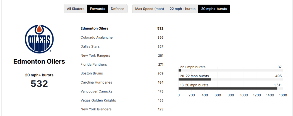 Edmonton has had 532 bursts of 20 mph, while Florida’s forwards have had 271. It is a significant difference, and we saw that in Game 1, but not in Game 2. The Oilers have to play to their strengths.