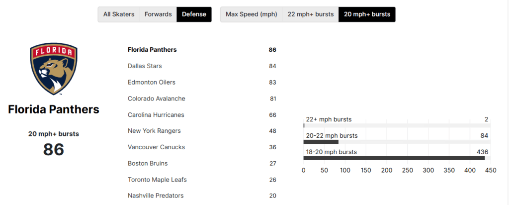 The Panthers’ blueliners have 86 bursts to the Oilers’ 83. But you will notice Dallas had 84, and led through the first three rounds, but the Oilers’ forwards were still able to attack and put them on their heels. They should be able to do the same v. Florida. It won’t be easy, as Florida has been excellent defensively and very connected in their own zone, but the Oilers showed in Game 1 they can generate many quality chances.