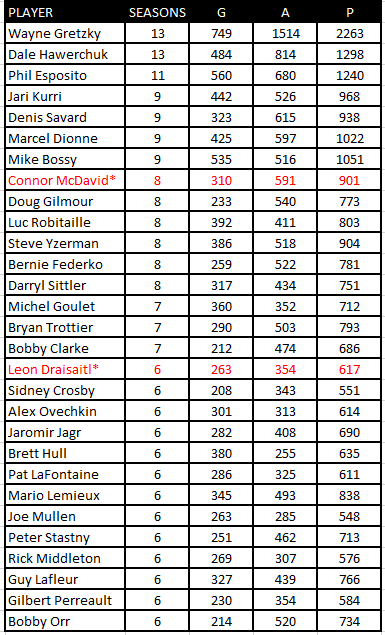 — Leon Draisaitl picked up his 80th point of the season in Boston on Tuesday. It is the sixth-consecutive season he’s reached 80 points, and he is now one of only 29 players to do so. he joins teammate Connor McDavid as the only two players with an active streak of that length.