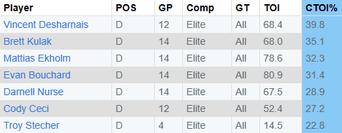 — Paul Coffey has shown a lot of confidence in Vincent Desharnais and Brett Kulak lately. They are still the third pairing in total minutes played, but Coffey has shown he isn’t afraid to play them against the other team’s top lines. I view this as a positive. The coach isn’t just guaranteeing minutes to players. He isn’t going overboard and suddenly altering the total minutes of his pairings, but he doesn’t just shelter his third pair. That being said, I think due to Oilersnation’s Sid’s post about TOI v. Elite, and Elliotte Friedman mentioning it on Saturday’s broadcast, it has led some interesting claims. Mainly that Darnell Nurse and Cody Ceci are now the third pair. Actual data will tell you this isn’t accurate. Let’s dig in.