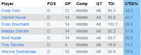 — Now, if you look at total actual minutes played, they rank: Bouchard (183.6), Ekholm (170.8), Nurse (161.3), Ceci (137.7) Kulak (137.7), Desharnais (119.3) and Stecher (34.4). Ceci and Desharnais missed two games, so you could add 17 minutes (half of Stecher’s) to their totals to see where they rank when playing. The total minutes shows Ekholm/Bouchard as top pair, Nurse-Ceci as second and Kulak and Desharnais as third.