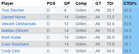Stecher has the highest TOI% v. Grit, while Nurse is second, which could be due to them playing together. But in actual minutes played Bouchard and Ekholm (73) and Nurse (72) are again the leaders.