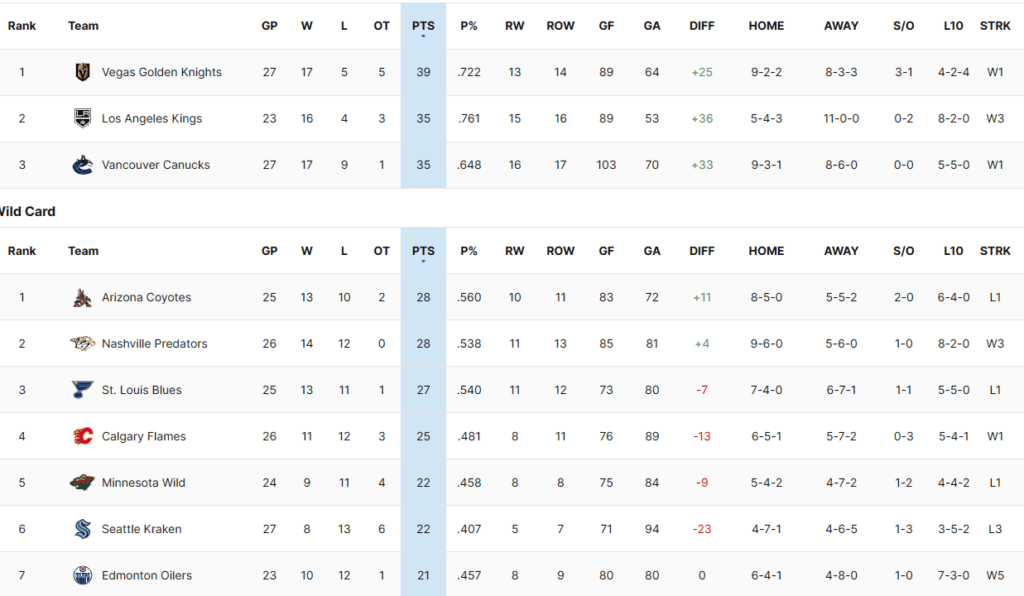 An Oilers regulation victory will hurdle them ahead of Seattle and Minnesota and they’d find themselves two points back of Calgary with two games in hand. The Oilers’ recent hot streak has them in a position to be back to .500 by the end of the weekend. The players have talked about that being their first goal. Get back to .500 and then start working their way higher up the standings. A victory tonight and Sunday would give them 25 points in 25 games. They had 28 points in 25 games last season — albeit they won 14 of their final 15 games, which was a huge factor in finishing with 109 points.