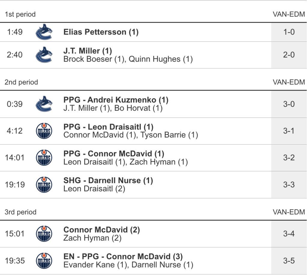 - Leon Draisaitl got the Oilers on the board (3-1) with a power play goal after McDavid’s pass attempt bounced to him at the side of the net and he buried it through a fallen Demko.