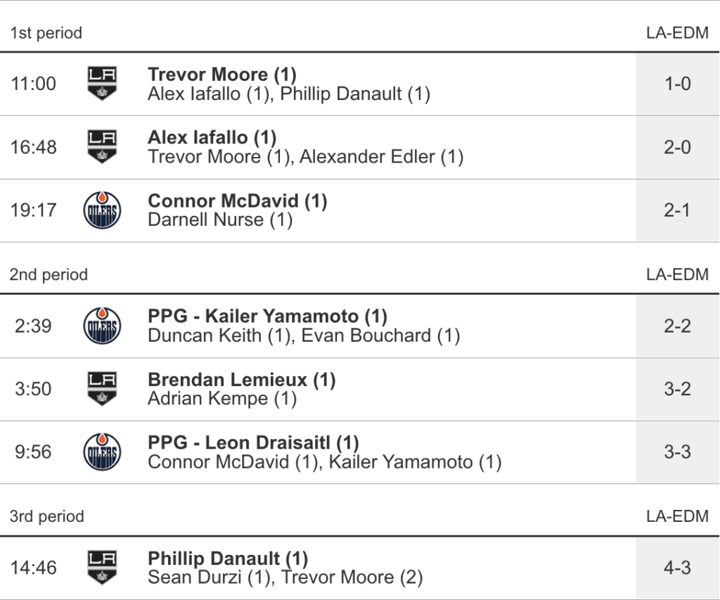 - @Trevor Moore opened the scoring (1-0) with a snipe from the slot after Iafallo found him with a pass he was able to tee off on. I hate to say it but it was a well-executed play by the Kings, and it put the Oilers in a hole.