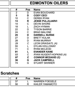 I put Ekholm as the seventh defenseman, because I’m not sure if he will dress or not. If he doesn’t and the Oilers go 11-6, I don’t see it being an issue for one game to be honest. They played 34 games with 11 forwards last year, and in the other 48 games they had six D-men dressed. Both the forwards and defenders will be fine with an 11-6 roster if needed.