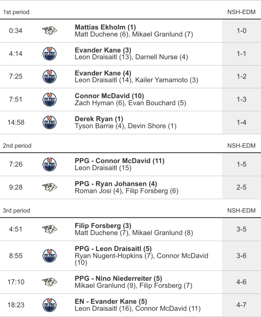 - Despite already having three points on the night, Leon Draisaitl didn’t have a goal yet so he fixed that (6-3) with a power play snipe from the slot after Nugent-Hopkins found him with a beautiful pass that the former MVP teed off on. If I was the Nashville Predators I would simply put Leon Draisaitl’s face on their jerseys, which would be a fitting tribute to a man that owns them at every turn. What else can you say about the guy after putting up five points (1G, 4) on the night?