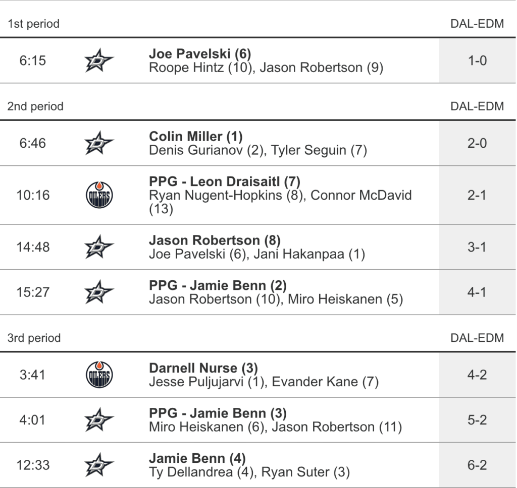 - Shortly after the third Stars goal, Jamie Benn put his team up by a field goal (4-1) after Jason Robertson basically dangled Campbell from behind the net only to lose the puck in the crease, leaving his captain with a tap-in. Benn added a second goal (5-2) early in the third period on the power play after a blocked point shot took a friendly bounce right onto his stick with an open cage to shoot at. Benn completed the hat trick (6-2) only a few minutes later after he broke into the Oilers zone on an odd-man rush and rifled a shot over Campbell on the glove side.