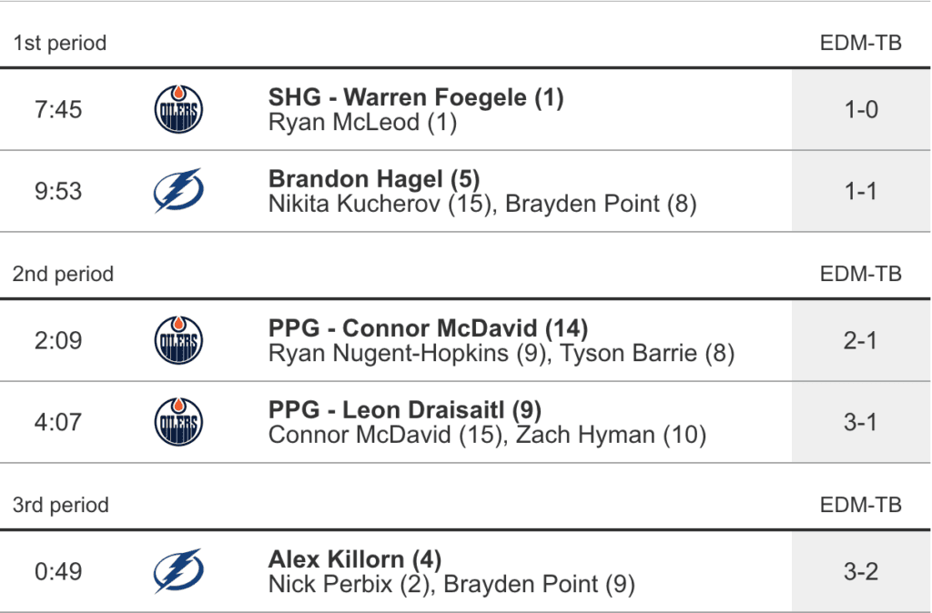 - Leon Draisaitl put the Oilers up by a pair (3-1) with a second power play goal for the boys after McDavid found him all alone in front of the net with enough time to rip a backhander up and over a sliding Vasilevskiy.