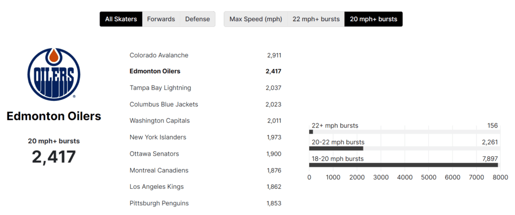 In the regular season the Oilers team was the second fastest in terms of bursts of speed. The Kings were ninth, but Edmonton had 550 more bursts of 20mph than LA.