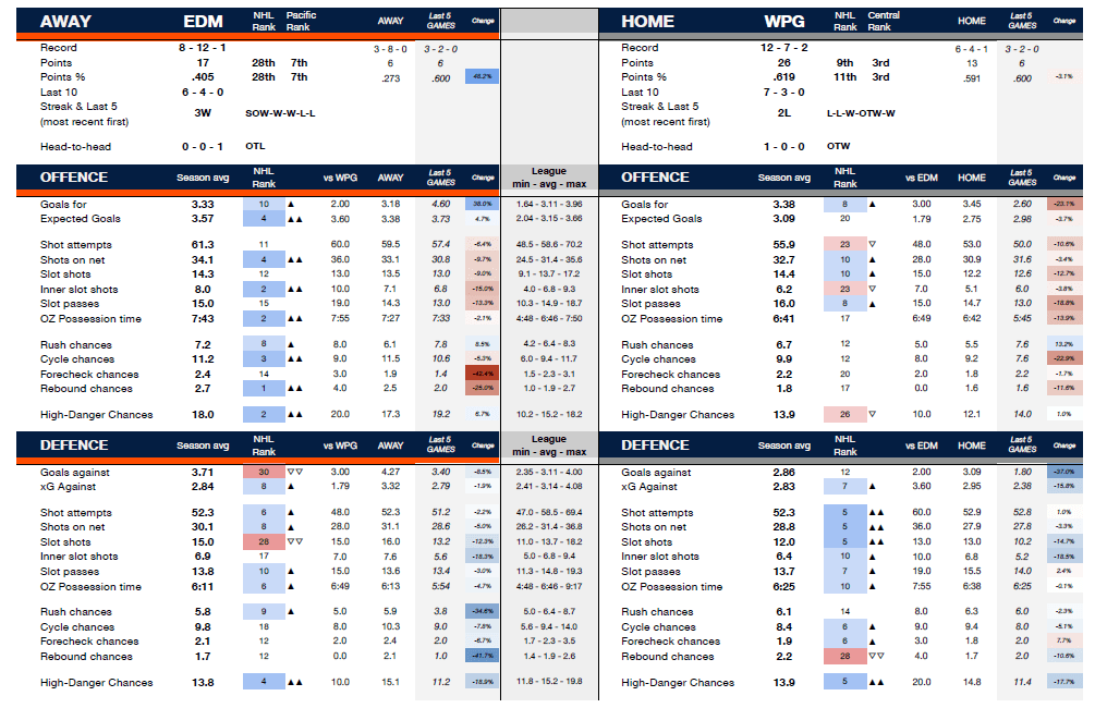 Edmonton’s offence has been great early in games, but slows down in the final 40 minutes. By period they’ve scored 32, 22 and 15 goals. Winnipeg is the opposite. They’ve scored 16, 26 and 27 from the first to third periods. But the Jets don’t give up as much as Edmonton. They’ve allowed only 15 goals in the first period, which is sixth lowest, and they’ve allowed the sixth and seventh fewest in the second and third periods. Even during their hot streak the Oilers rank 17th, 18th and 19th in goals allowed by period.