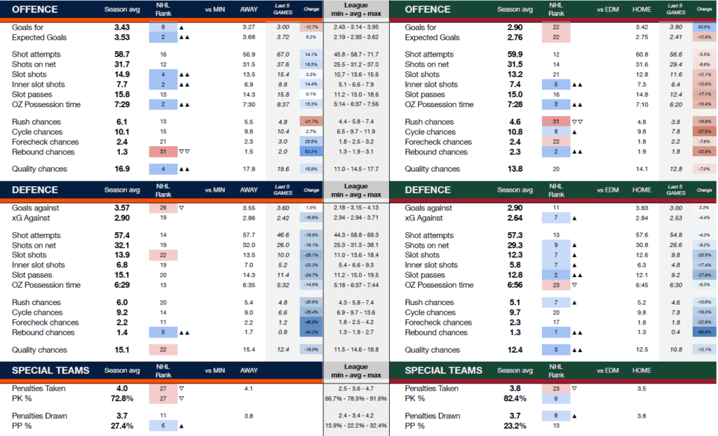 The Wild don’t generate much, despite having lots of offensive zone possession. They will try to wear down the Oilers on the cycle and crash the net for rebounds.