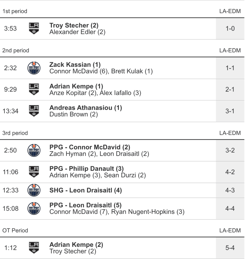 - @Connor McDavid pulled the Oilers back to within one (3-2) on the power play after a beautiful move in front of quick that saw him nearly lose the puck on Quick’s poke check only to pick it up again and roof a backhander over the flailing goalie.