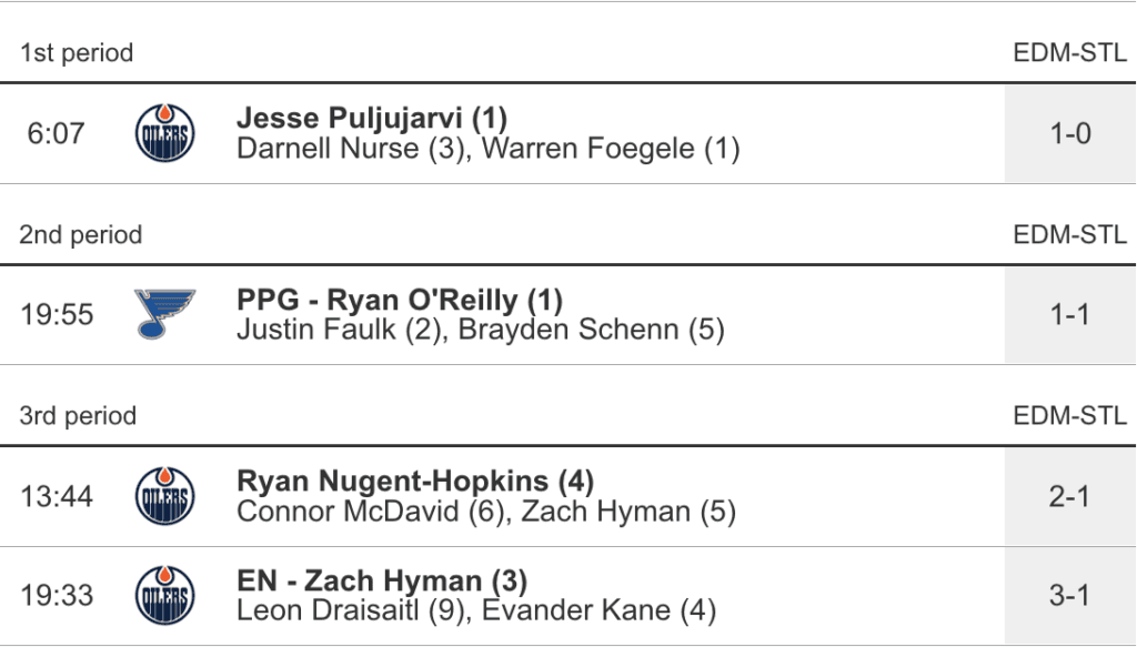 - Jesse Puljujarvi opened the scoring (1-0) after getting his stick on Darnell Nurse’s shot from the high slot, deflecting the puck perfectly through a couple of Blues defenders before making its way past Binnington. Today on Better Lait Than Never, I talked about Puljujarvi needing to get on the board so that he could gain a little bit of confidence, and I’m hoping this goal will be the start of a productive run for the big fella.