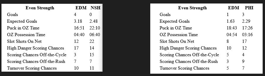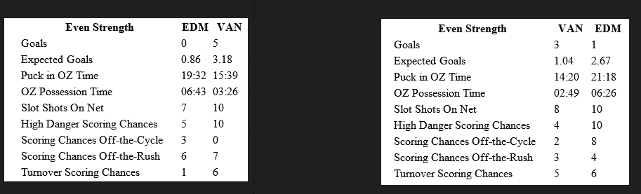The disparity is obvious. Vancouver scored eight even strength goals in two games with a combined 6:15 of offensive zone possession time. Edmonton had zero goals in 6:43 of game one.