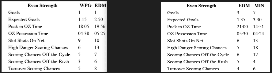 — Their best game of the season was the Winnipeg game, as far as limiting chances and playing solid hockey. They outshot the Jets 32-14 at 5×5, had twice as many high-danger chances, but couldn’t finish.