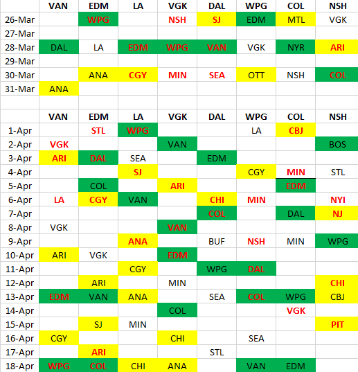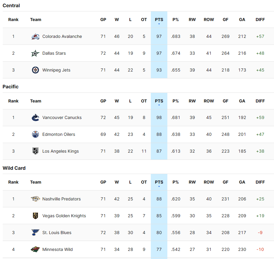 But they are in a battle with Colorado and Dallas for first in the West and the #1 seed. Colorado has won nine games in a row to move ahead of Vancouver in P%, and the race for top spot in the West and Central will be tight. As will the race for second place in the Central, third place in the Pacific and the two wildcard spots.