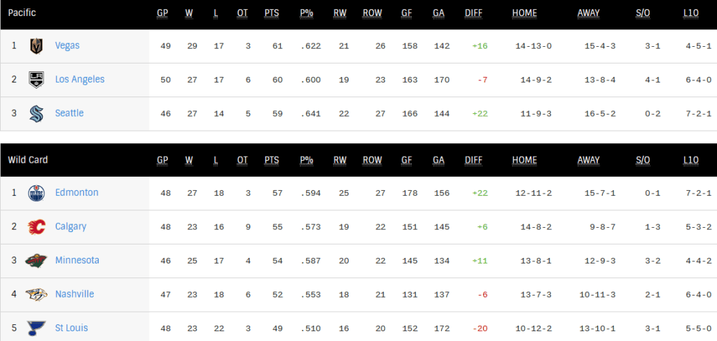 — The biggest benefit the Oilers have is their remaining schedule. Half of their games are against bottom 10 (BT) teams. The Oilers have 17 games v. those teams and 17 against the rest of the NHL. Seattle also has 17 v. BT teams, Calgary 16, while Los Angeles and Vegas only have eight.
