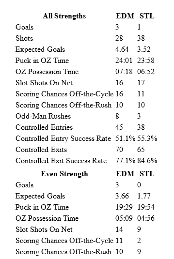 The most impressive aspect of the Oilers win, was they generated 11 scoring chances off the cycle at 5×5 and held the Blues to only two.