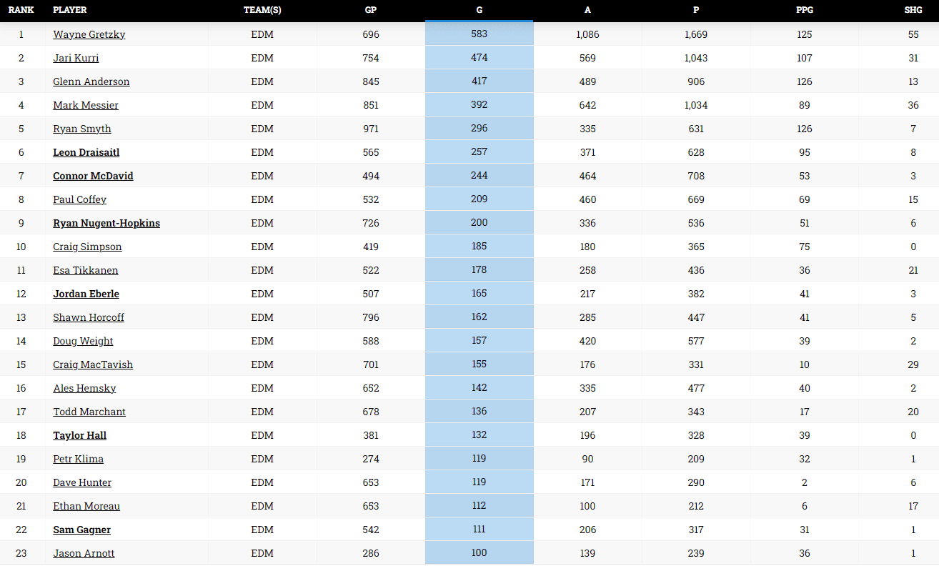 Only 23 players have scored 100 goals for the Orange and Blue. RNH should pass Paul Coffey for eighth this season, but it is unlikely he finishes any higher. Leon Draisaitl needs 40 goals to move into the top five.