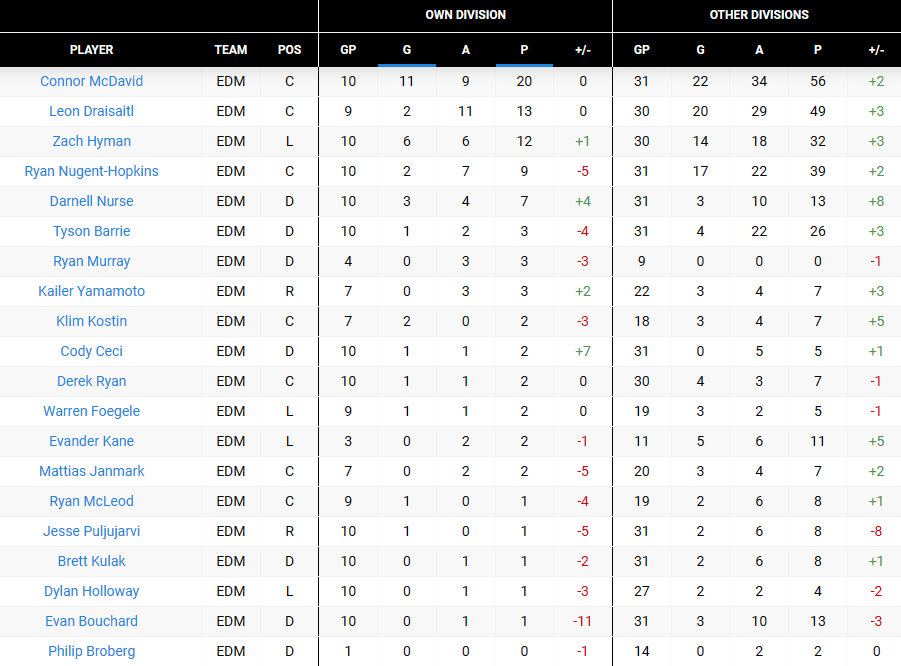 — So far this season most Oilers players have produced better v. non-divisional opponents.