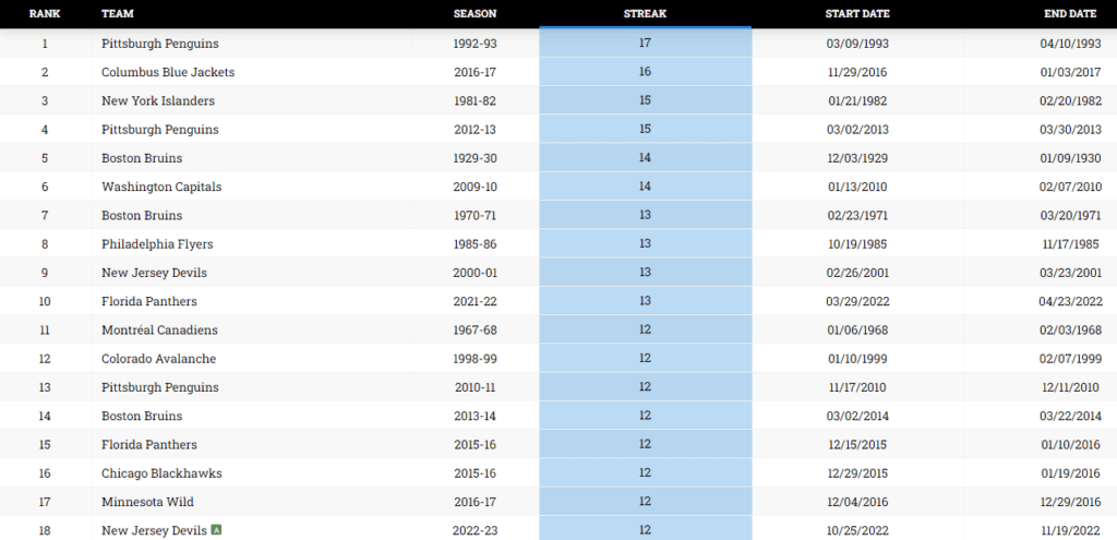 New Jersey is the third team in the last six seasons to win 12 in a row. Florida won 13 in a row last season and Columbus won 16 in 2017, which is the second longest behind Pittsburgh’s 17-game winning streak between March and April 1993.