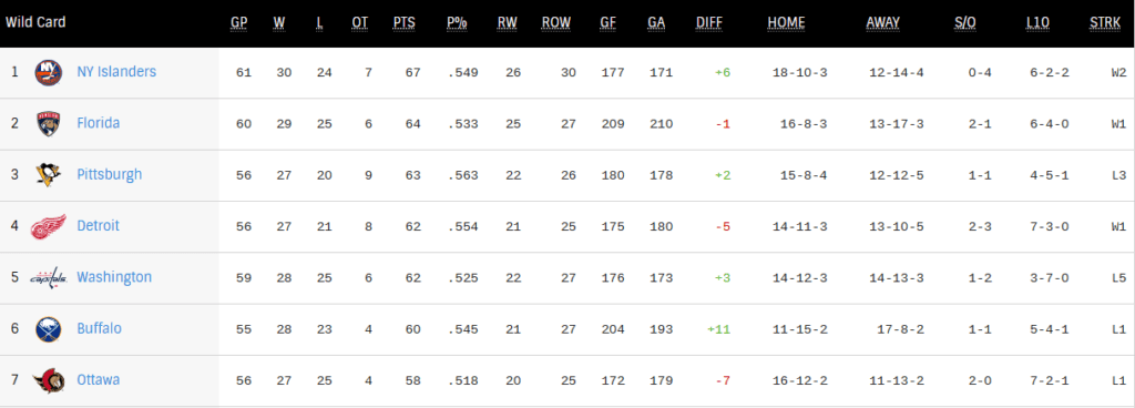 — The Penguins do have the best overall P%, and with five and four games in hand on the Islanders and Panthers respectively, the Pens are still in a decent spot, but Detroit and Buffalo are pushing, and the Penguins need a win. They’ve lost three in a row, including two to the Islanders, which tightened the gap in the wildcard race significantly.