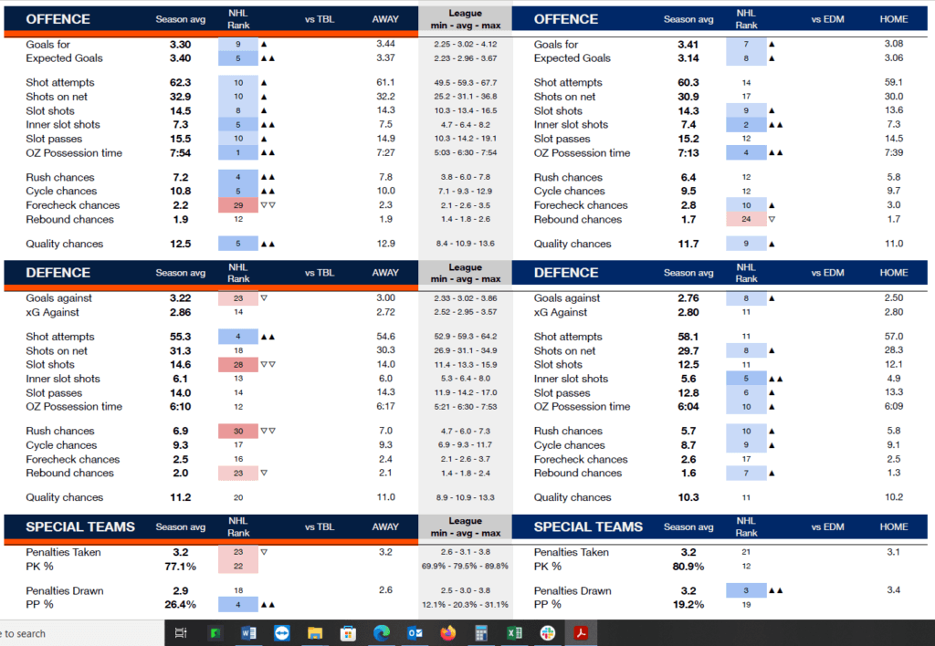 The Lightning are top-10 in seven offensive categories and in eight defensive categories. Edmonton continues to be very competitive offensively with 11 top-10 offensive categories, but are only in the top-10 in one defensive category. Allowing slot shots, rush chances and rebound chances are the Oilers weaknesses. The rush chances have improved significantly (except for the Minny game) under Woodcroft and that must continue on the first three games of this road trip if they have any hopes of going 1-1-1.