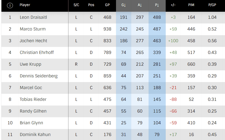 — Interesting to see five current or former Oilers among the top-11 German players: Draisaitl, Jochen Hecht, Tobias Rieder, Brian Glynn and Dominik Kahun all played for Edmonton.