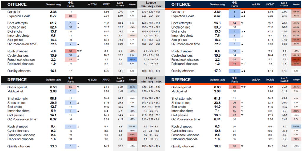 — Edmonton enters the game fourth in offence averaging 3.69 goals/game. They need to exploit the Kings’ inconsistent goaltending, while also being aware defensively. Edmonton has scored 3.78 goals/game on home ice, but they’ve also allowed 3.78.