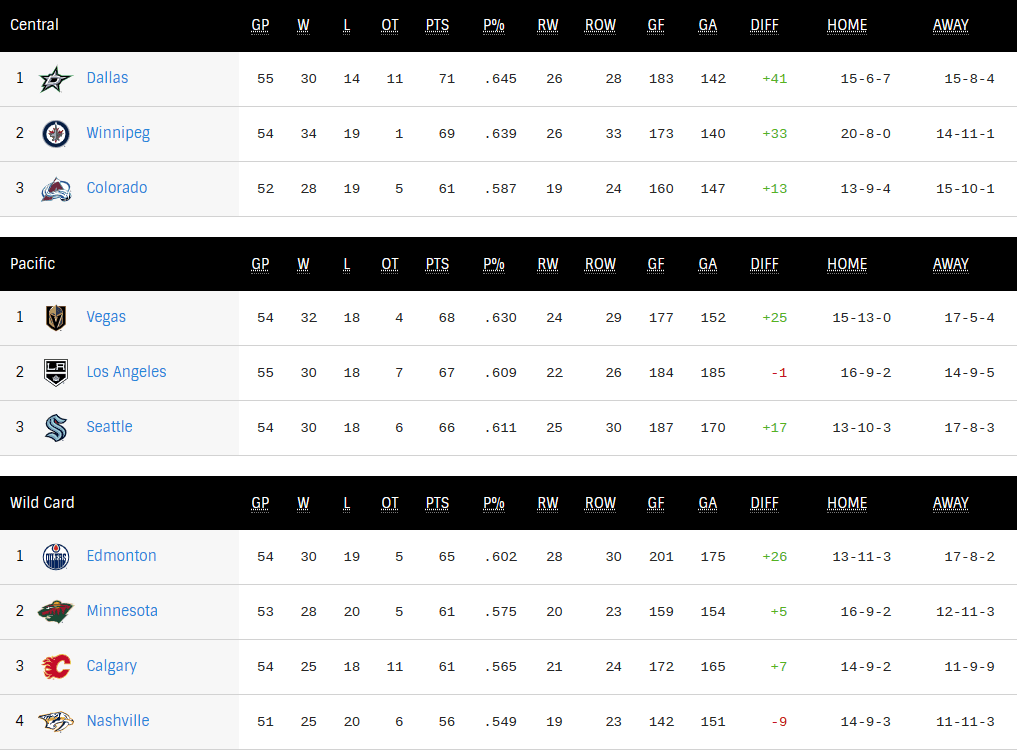 — The Oilers occupy the first wild card spot, but they are only three points out of first place in the Pacific Division. It continues to be a very tight race.