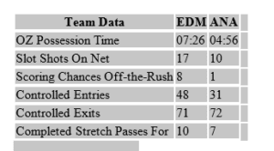 The data above, courtesy of SportLogiq, illustrates how much more possession time the Oilers had as well as more dangerous shots and scoring chances off the rush. Edmonton missed two assignments defensively in their own zone, however, which led to the Ducks second and third goals.