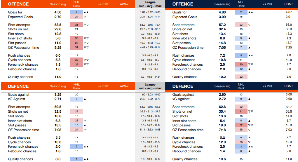 — Courtesy of SportLogiq, here is a look at where the Oilers and Flyers rank offensively and defensively.