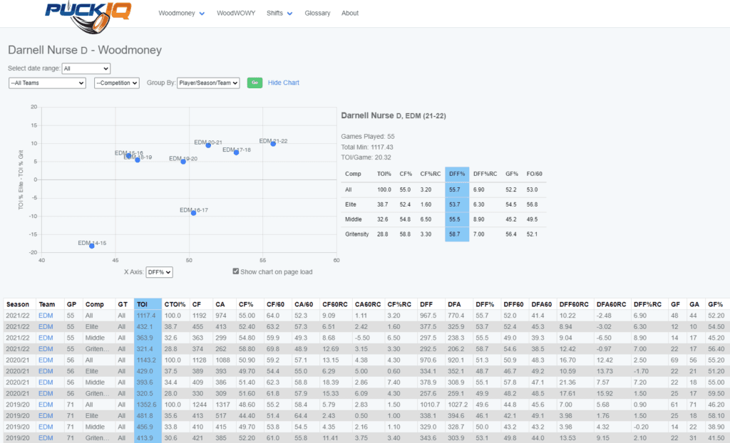 Suggestions that Nurse is having a worse season than last year are strange to me. He has scored seven fewer goals at 5×5, but has the same amount of assists in similar TOI and games played. More on that later.