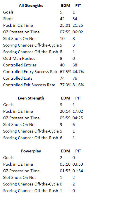 — While the result won’t impact the standings or home ice advantage in the Western Conference, Woodcroft will want his team to continue playing well. They dominated the Penguins for long stretches last night. There were numerous shifts at 5×5 where the Oilers looked like they were on the power play as they controlled the puck and moved it around easily. Sportlogiq’s numbers reflect the Oilers’ dominance. The Penguins had a combined two scoring chances off the cycle and off the rush.