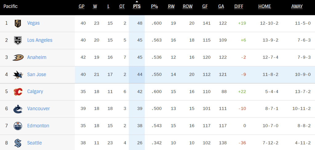 Edmonton is 7th in the Pacific division with 38 points, but that is a bit deceiving due to only playing 35 games. Their points% has them ahead of Anaheim and Vancouver and very close to LA and San Jose. Edmonton and Calgary have four games in hand on Vancouver, five on LA, Vegas and San Jose and seven on Anaheim.