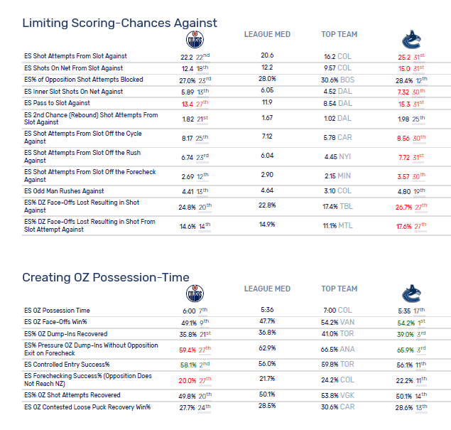 Vancouver is 30th or 31st in nine of the 12 categories in limiting scoring chances. They are 30th in shots from the slot off the rush. McDavid leads the NHL, by a large margin, in scoring chances off the rush. Not a good sign for Vancouver.