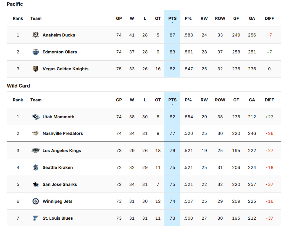 The Oilers also have a lot to play for in the Pacific Division. Defeat Seattle in regulation tonight and that virtually eliminates another team from catching them as they’d be 10 points up on Seattle. The Oilers also got some help on the out-of-town scoreboard last night with Toronto defeating Anaheim 5-4 in overtime. The Ducks are four points up on the Oilers with eight games to play. Edmonton owns the tiebreaker (regulation wins) and if they can win two more games than the Ducks they could catch them, and even if they don’t catch Anaheim, they want to finish ahead of Vegas and secure second place in the Pacific.