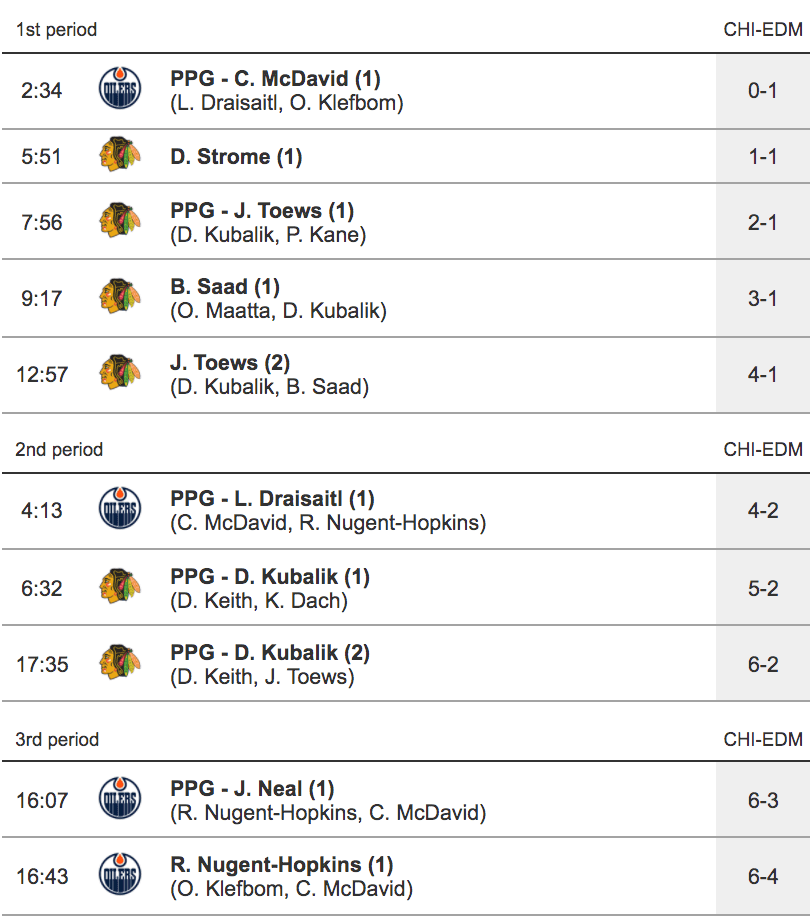 - Connor McDavid opened the scoring at 2:34 of the first period by roofing the puck over Crawford after the Chicago Blackhawks took a too many men penalty, giving the Oilers the change to punish them for it. Despite the disappointing finish, McDavid finished the game with four points.