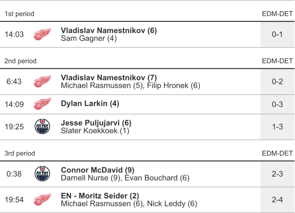 - Connor McDavid pulled the Oilers to within a single goal (3-2) after he took a feed from Darnell Nurse on the left side of the ice and ripped a wrister past Nedeljkovic down low. It was obviously a huge goal because it put the Red Wings back on the heels and the Oilers in a position to complete the comeback.