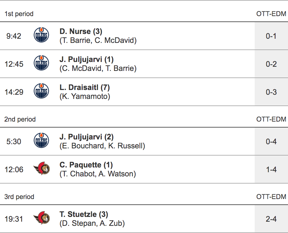 - If I’m going to nitpick a little bit, I think that the Oilers took their foot off the gas in the latter third of the game and it gave the Sens some life even if they weren’t able to get anything done with it. I would have much rather seen the boys put finish them off with hockey’s equivalent of a Mortal Kombat fatality but it was just not meant to be, I guess. Maybe next week.