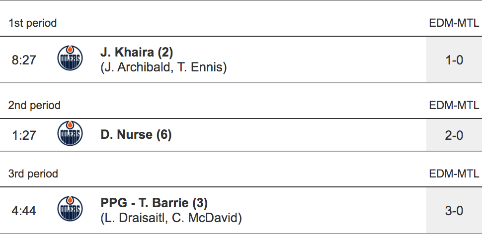 - @Tyson Barrie extended the lead to three goals (3-0) on the powerplay with a big blast from the point that made its way through traffic and beat Allen high to the blocker side. It’s been a long time since the Oilers have had a guy that can tee off on a one-timer quite like Barrie and it adds a different element to a powerplay that can certainly use some variety.