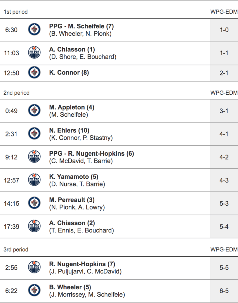 - @Mark Schiefele opened the scoring for the Jets (1-0) midway through the first period with a powerplay goal that came on a weak call, in my opinion. Regardless of my thoughts on the penalty, Winnipeg was rewarded for moving the puck around the Oilers’ zone effectively and you have to give Wheeler credit for setting Scheifele up on a tee for the one-timer.