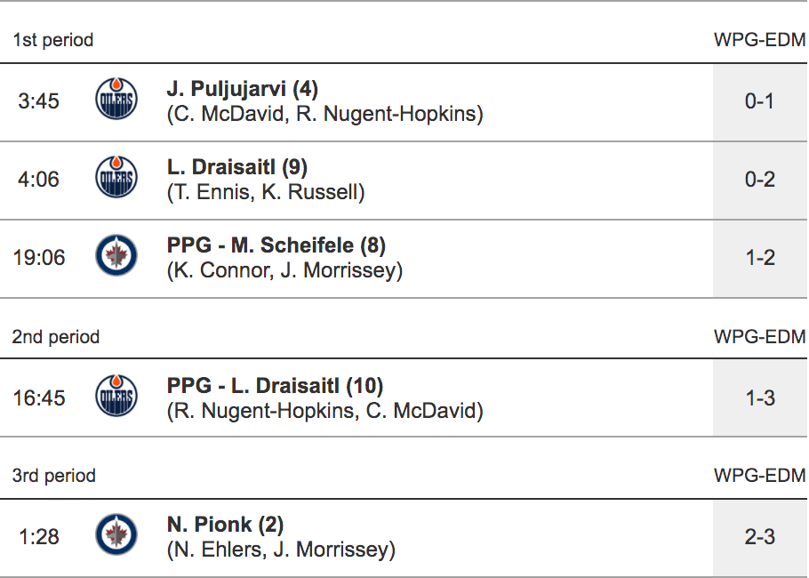 - @Jesse Puljujarvi got the Oilers on the board early (1-0) with a beautiful snipe of a goal that beat Hellebuyck up high before the goalie even knew what happened. I’ve gotta say, seeing Puljujarvi score goals like this makes me excited for what his future holds now that he’s back in Edmonton with another year of Finnish software upgrades.