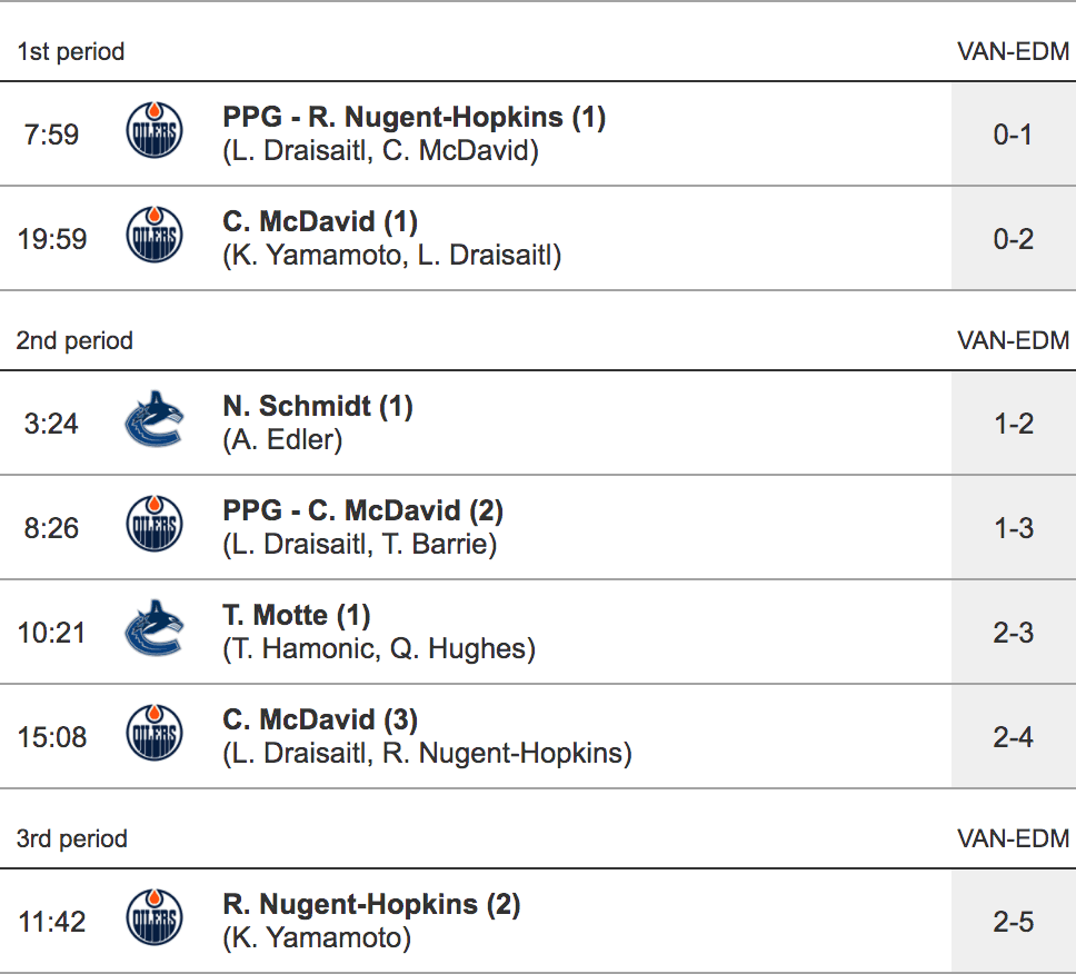 - With less than two seconds left on the clock at the end of the first period, the Oilers managed to pull off a sneaky little faceoff play that allowed @Connor McDavid to slip behind the defence and roof the rebound up and over Demko to extend his team’s lead to two goals (2-0). About 10 game minutes later, he added a face-melting coast-to-coast goal (3-1) that not only embarrassed the Canucks’ defence but also had Thatcher Demko so confused that he likely considered a career change. Wrapping up the hat trick (4-2), McDavid further haunted Demko’s night with a beautiful move from his forehand to the backhand before roofing the puck into the top shelf. After being held off the scoresheet last night, McDavid went supernova and he was completely unstoppable by anyone the Canucks tried to put in his way.