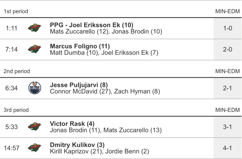 - Are you surprised that Joel Eriksson Ek was able to open the scoring (1-0) only 71 seconds into the hockey game? You’re not, are you? Another garbage start for the Oilers.