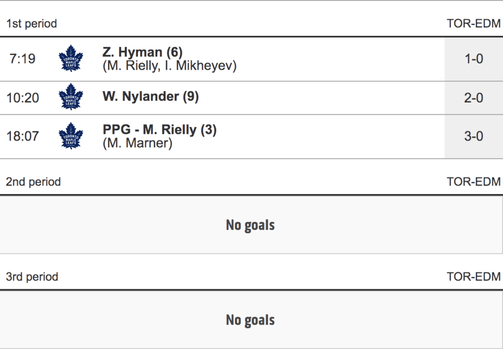 - Think the Leafs were done with two first period goals? No, friends. Not tonight. @Morgan Reilly added a third (3-0) after his shot from the point made its way through traffic to beat Koskinen through the five-hole with the puck trickling its way over the line in slow motion.